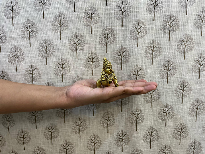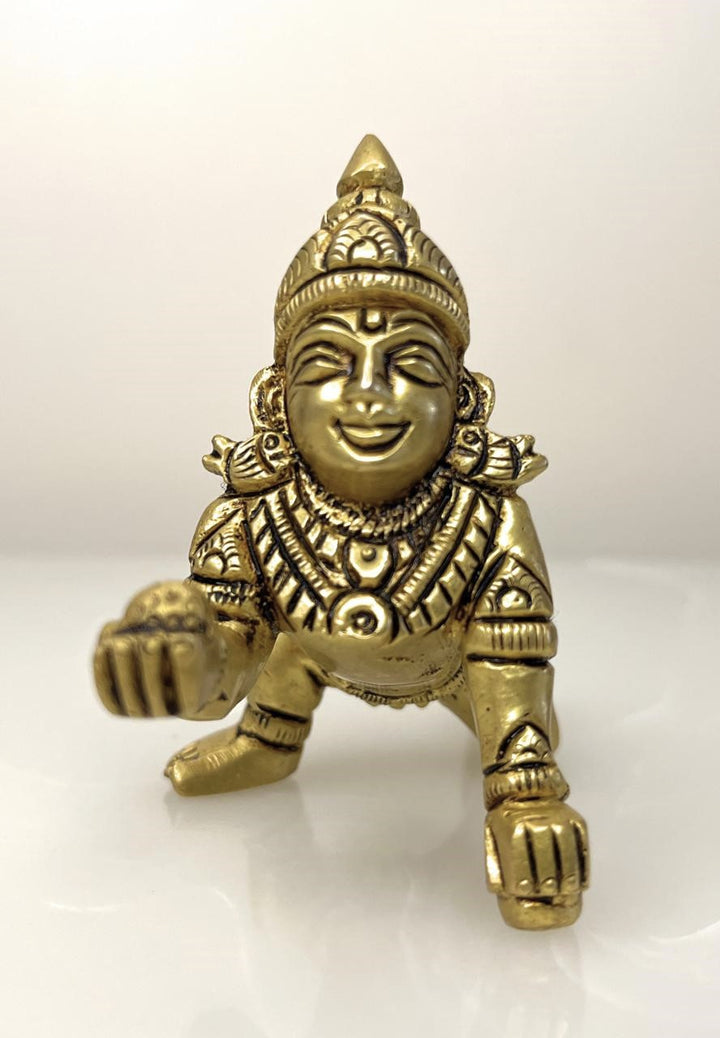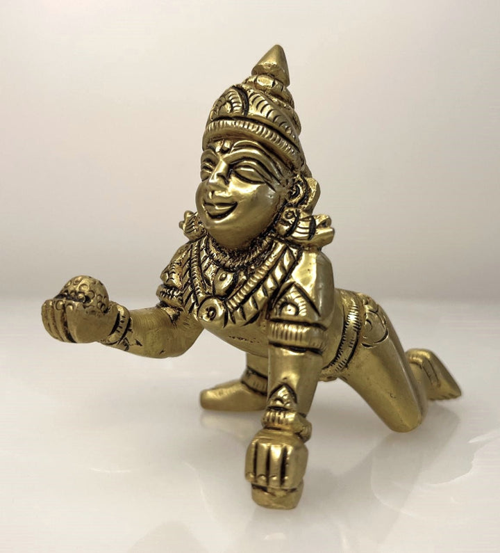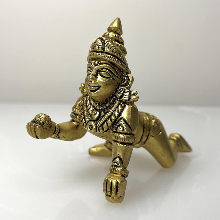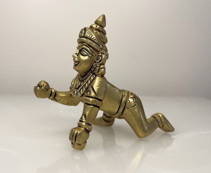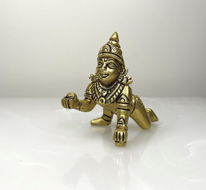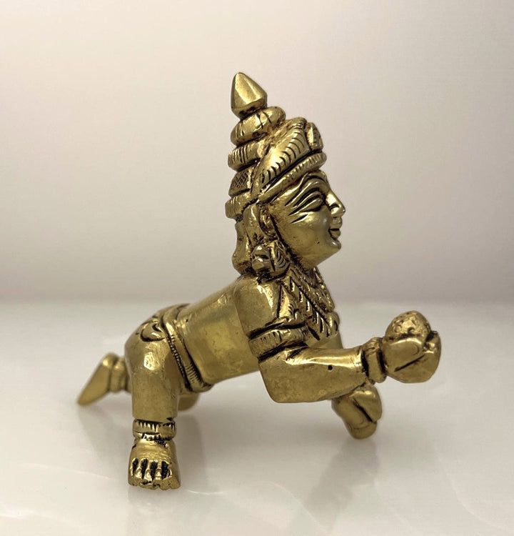 This small Lord Laddu Gopal Brass Statue represents the divine presence of Lord Krishna in his child form. Laddu Gopal is the Childhood form of Lord Krishna also known as Bal Gopal. The playful nature of this deity symbolizes the pure love between devotee & the Divine. In this enchanting form, Krishna is depicted as a mischievous toddler, crawling on his hands and knees.