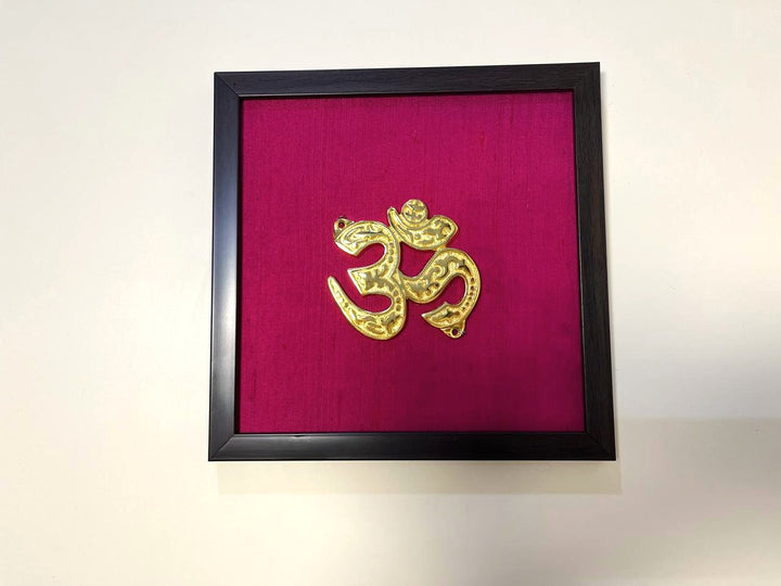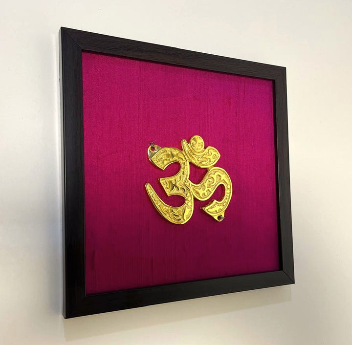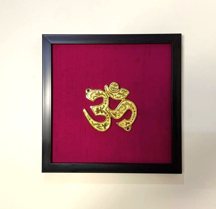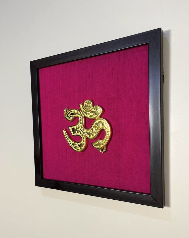 Aum Auspicious Symbol Wall Décor I Spiritual Symbol Wall Décor I Om Brass Accent on Magenta silk backdrop I Brass & Silk Shubh Chinha Wall Frame