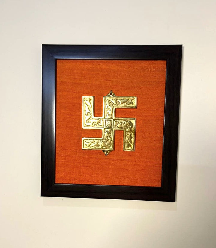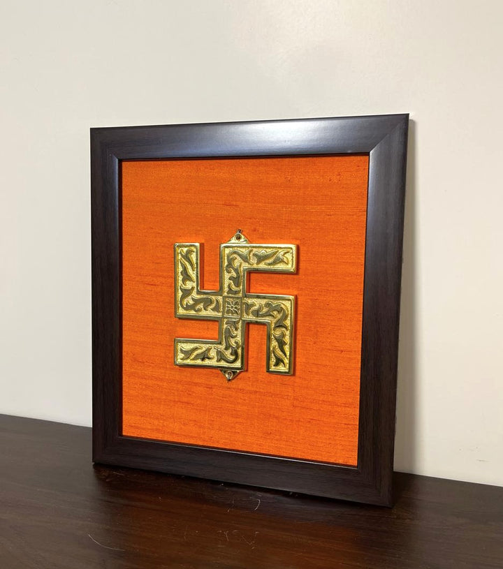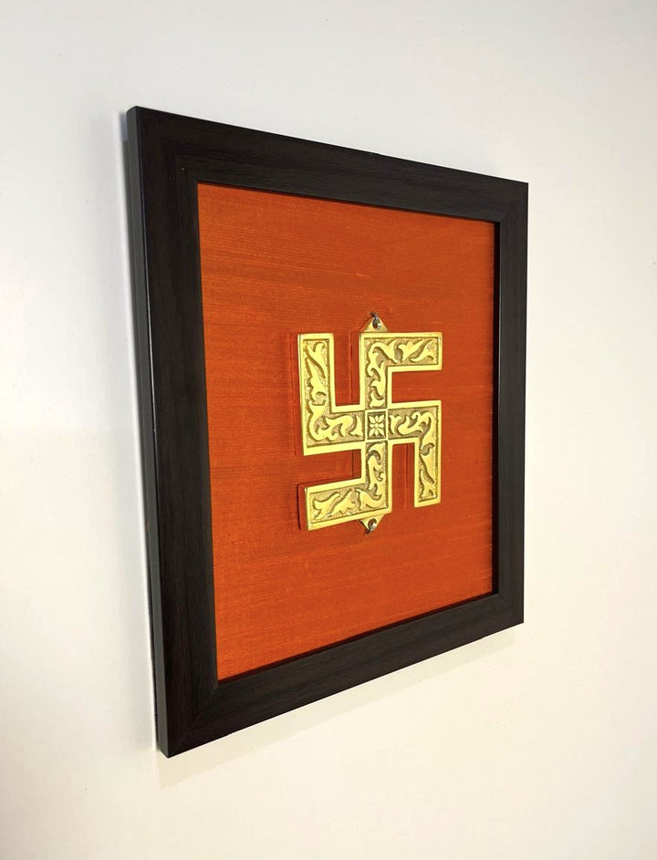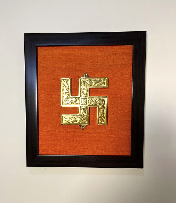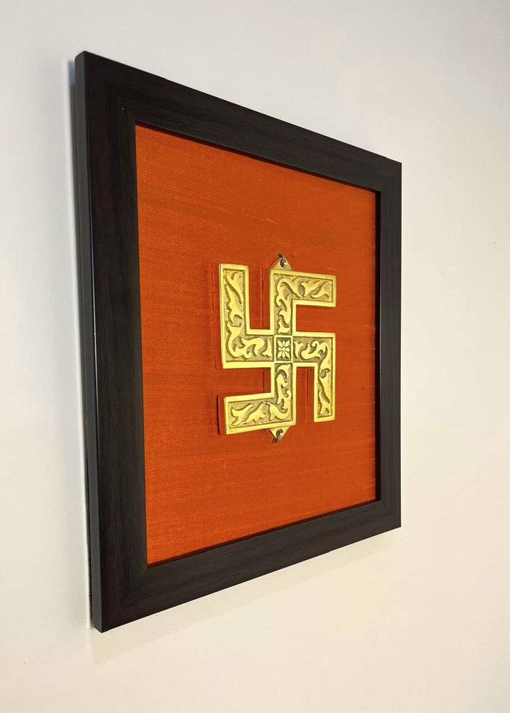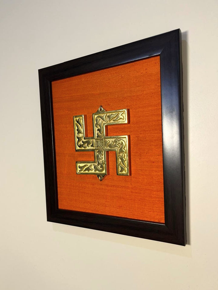 Swastik Symbol Pure Raw Silk Brass Wall Décor I Spiritual Symbol Wall Décor I Shubh Chinha Wall Décor I Vibrant Orange & Gold Swastik Symbol Wall Art