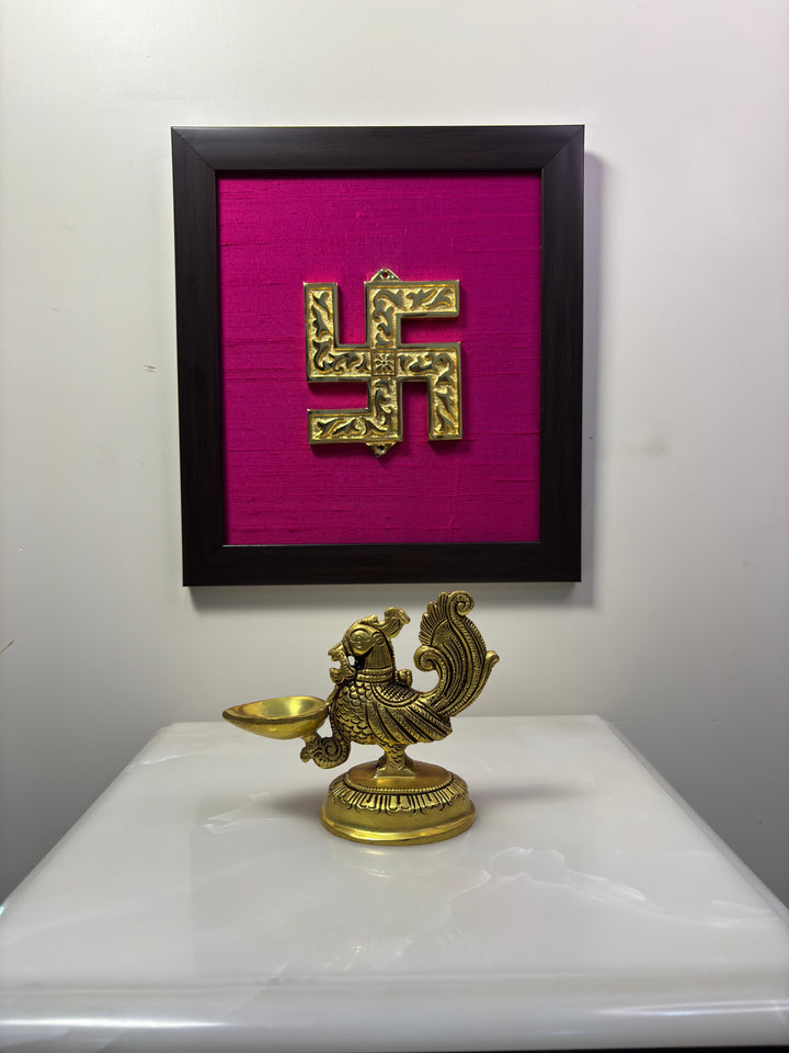 More than décor—it’s a visual mantra, a daily reminder of your inner light and connection to the eternal. A sacred piece that blesses your home with calm, clarity, and positive vibrations. Crafted not just with brass and silk, but with intention, devotion, and timeless wisdom. 10.5 Inches by 11.5 Inches Framed Wall Décor with a gleaming Brass Swastik Symbol on Magenta raw silk backdrop ideal for entrance lobbies, Living room, Meditation room or Home & Office temple spaces.