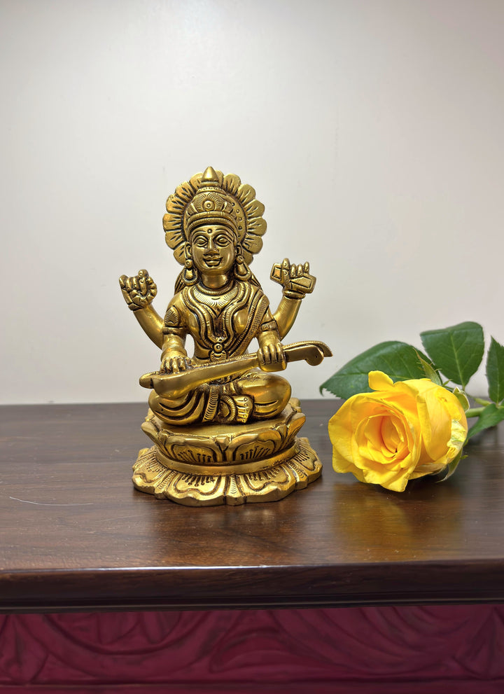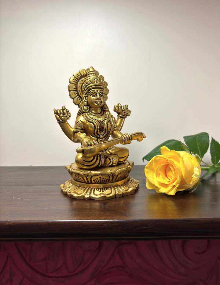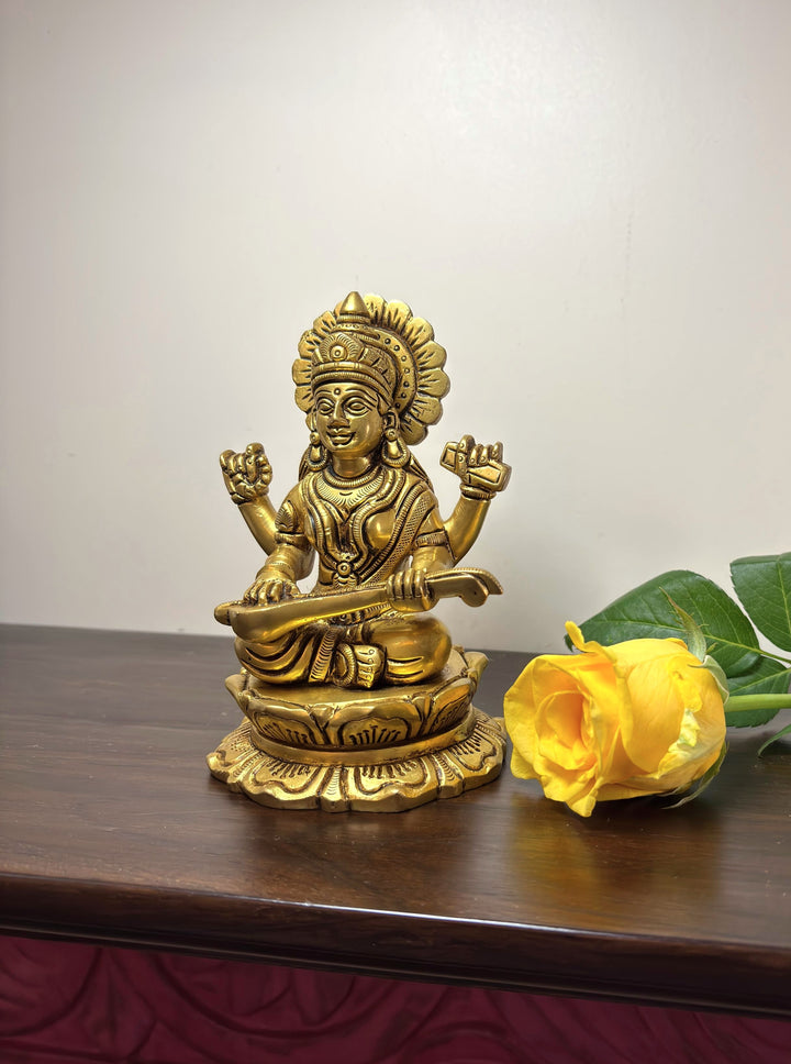 Invoke the divine presence of Maa Saraswati, the goddess of knowledge, music, and the arts, with this handcrafted brass idol. This idol isn’t just decor—it’s a living invocation of clarity, creativity, and grace. Whether placed in a sacred space or a modern home, it bridges tradition and inspiration, inviting Saraswati’s blessings into daily life. This brass idol is ideal for office desk, Study desk home temple or as an aesthetic piece of traditional décor as a constant reminder of the power of knowledge, creativity, and spiritual growth.