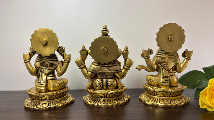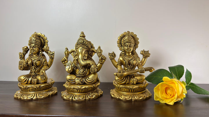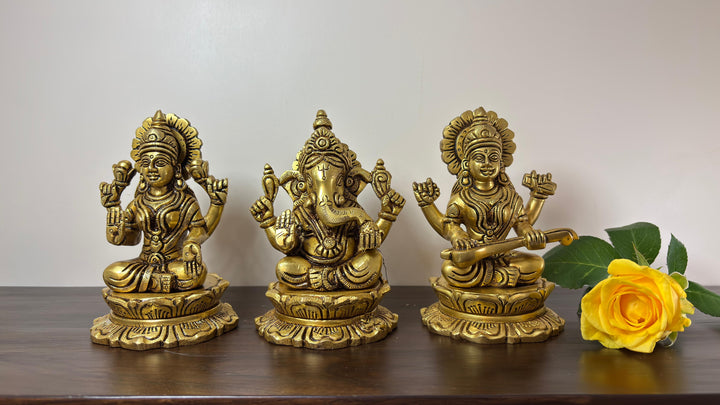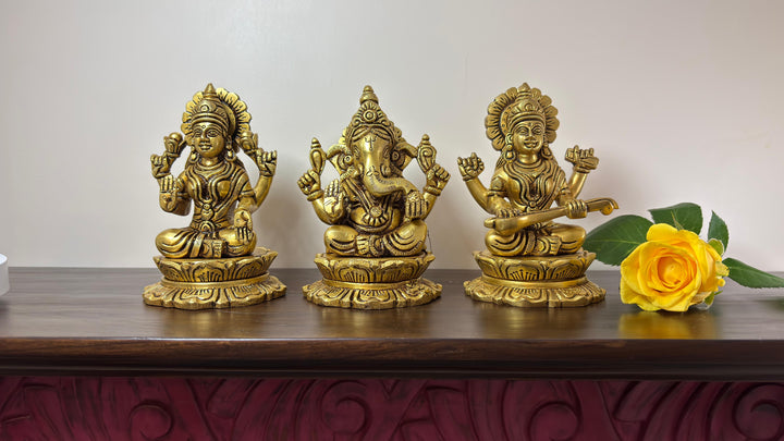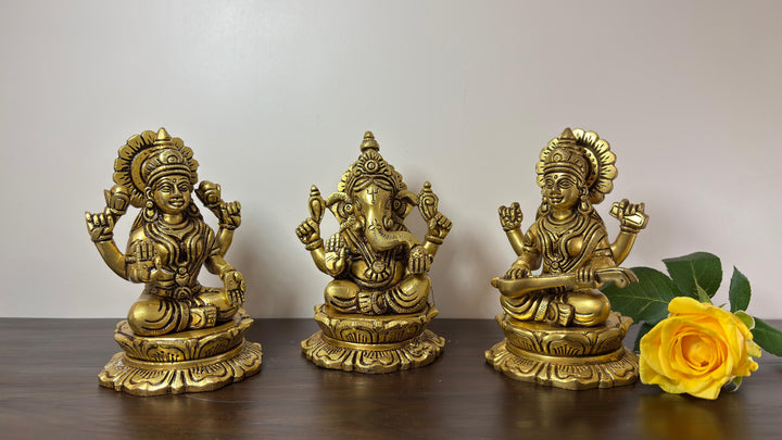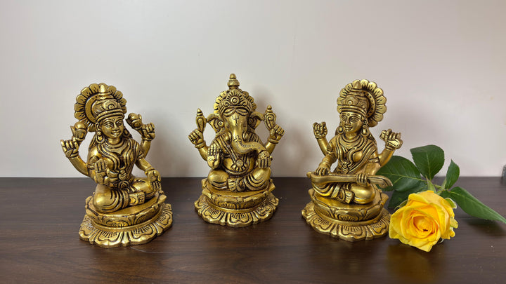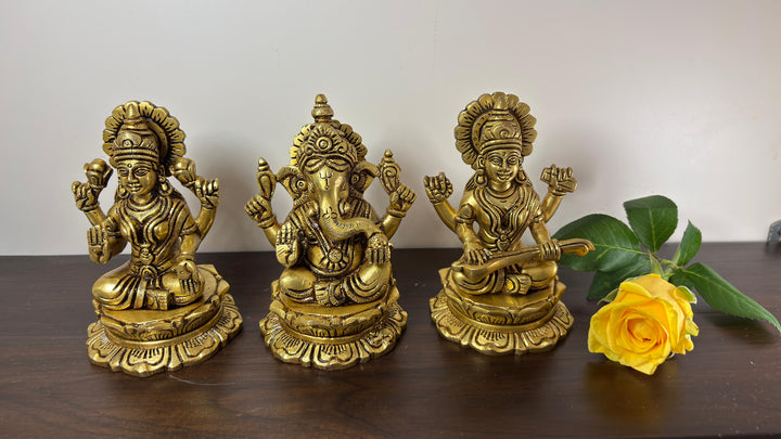 Invite peace, abundance and spiritual growth with this 4.5-inch superfine quality brass set of idols of Lord Ganesh, Goddess Lakshmi & Goddess Saraswati. The set of idols symbolizes a holistic approach to life—material success (Lakshmi), intellectual clarity (Saraswati), and obstacle-free progress (Ganesha). Together, they form a complete trinity of success—Lakshmi for wealth, Ganesha for wisdom, Saraswati for knowledge.
