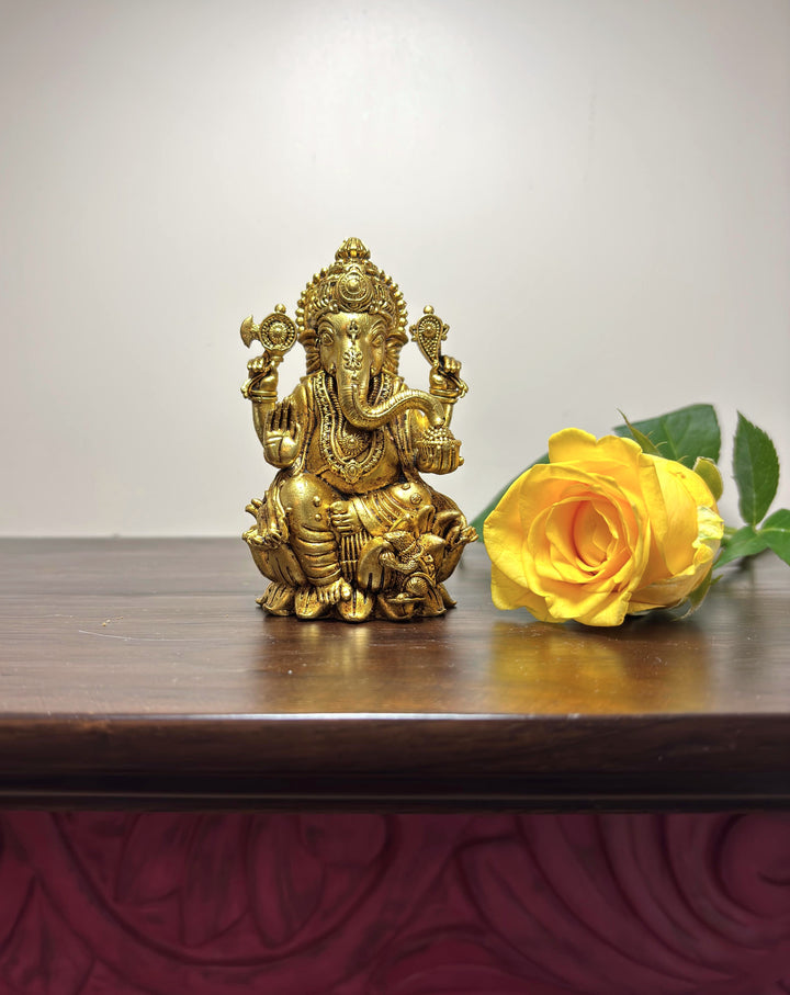 Grace your sacred space with this superfine 3.5-inch brass idol of Lord Ganesha, the remover of obstacles and harbinger of auspicious beginnings. Sculpted with exceptional detail and polished to a radiant finish, this piece embodies both artistic finesse and spiritual depth. This exquisite idol of Ganapati will infuse your home with clarity, joy, and sacred energy—where tradition meets timeless elegance.