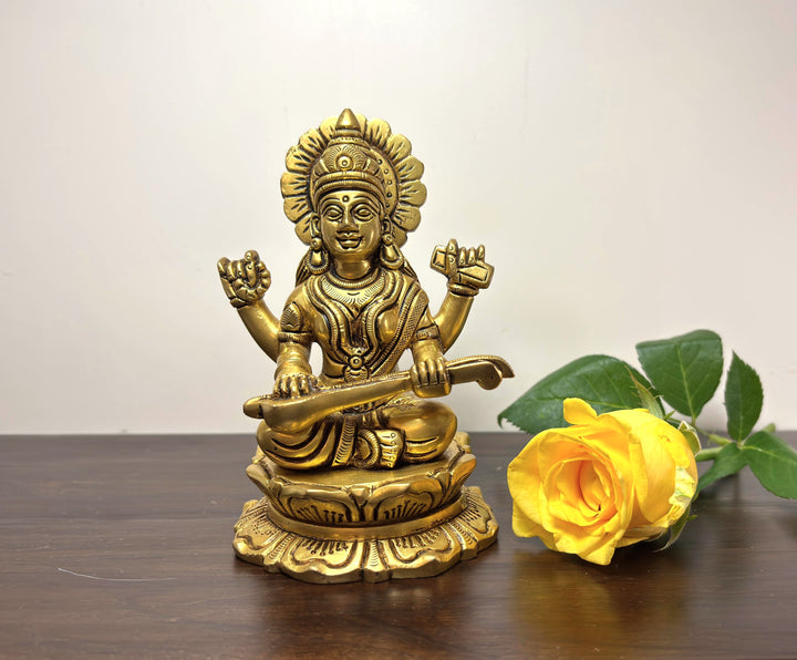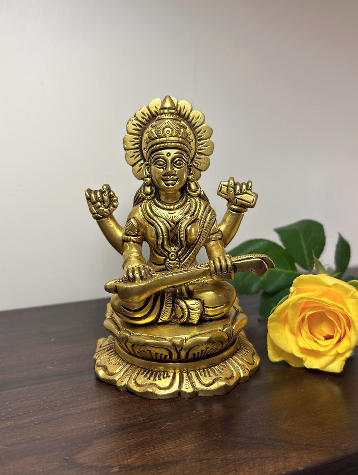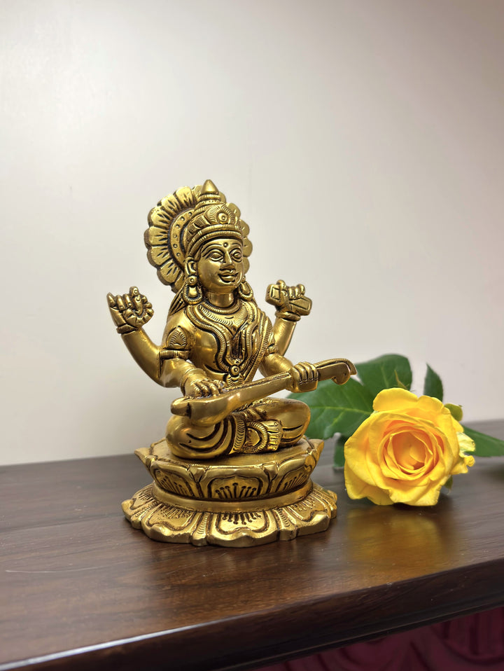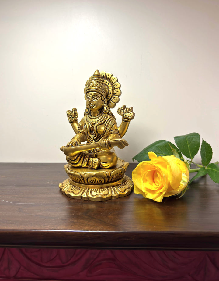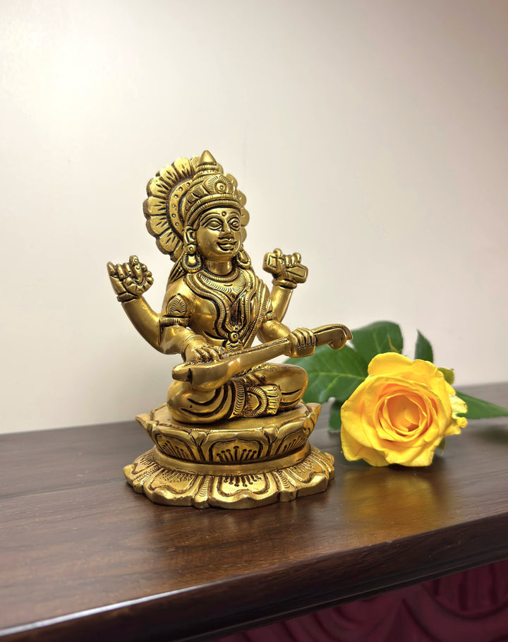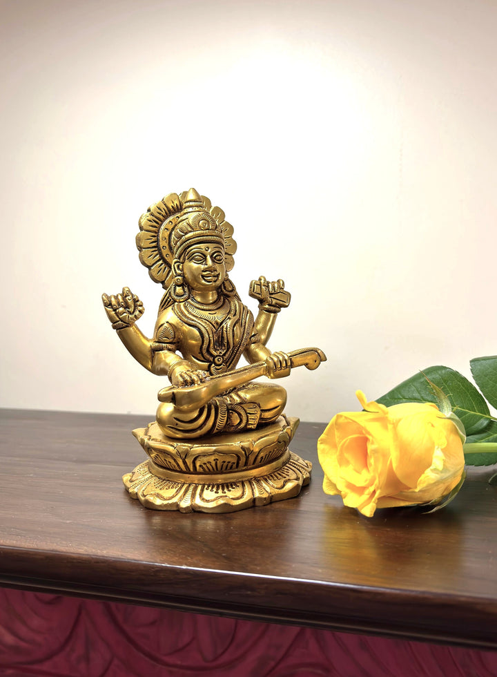 • Special Features: Finely carved brass idol of Goddess Saraswati on a Lotus Base