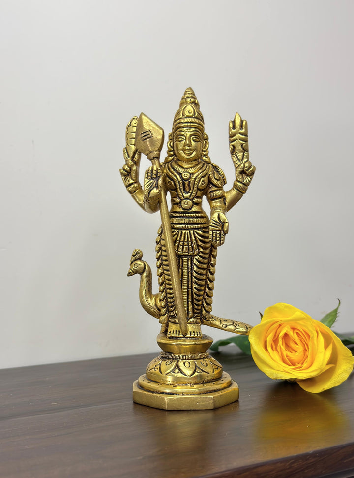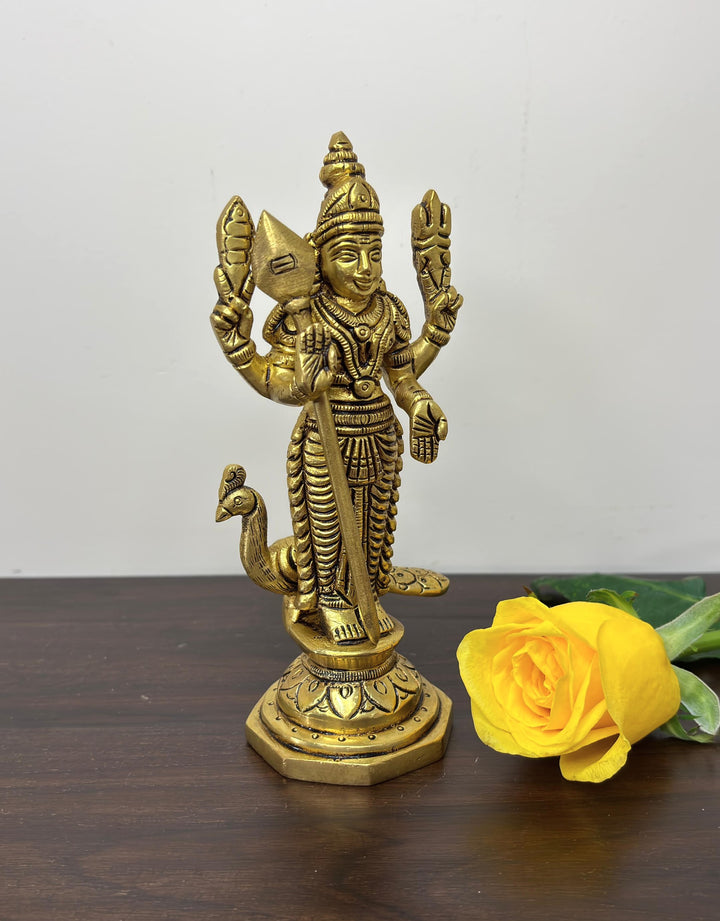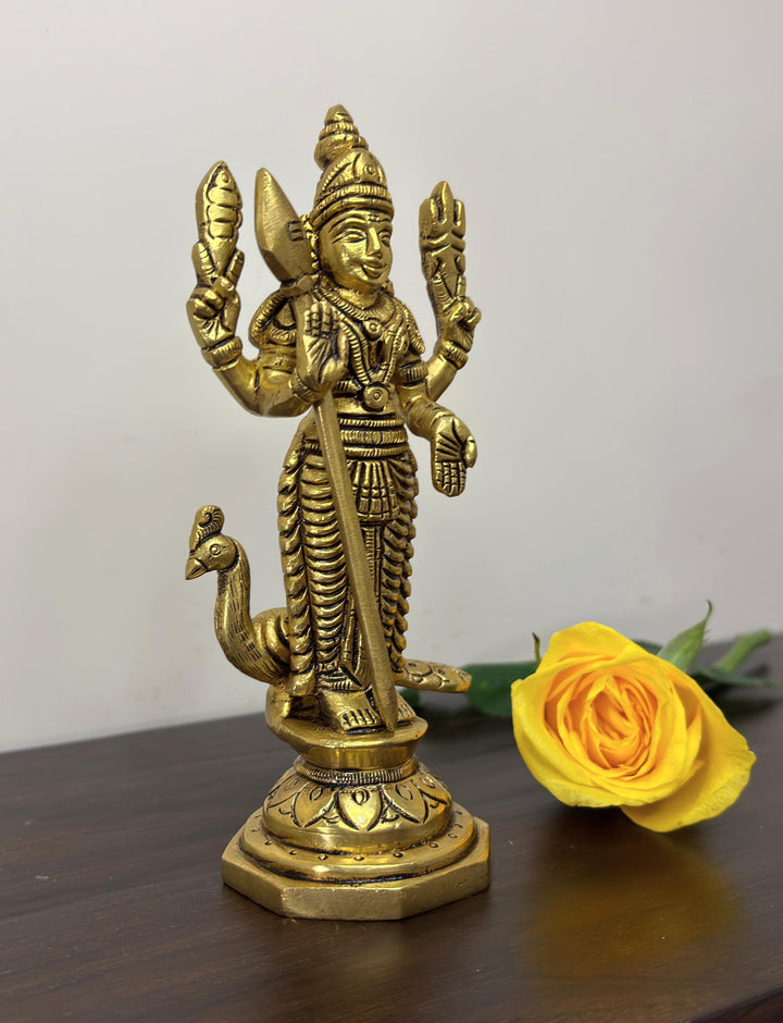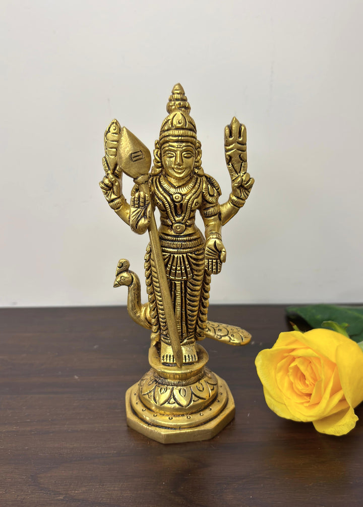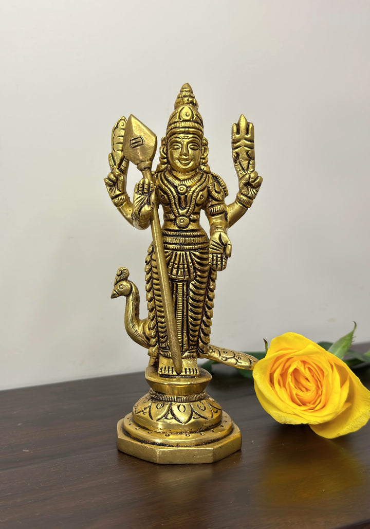 • Special Features: 6 Inches Finely carved idol of Lord Murugan in standing posture, holding the Vel with divine authority, accompanied with a Peacock
