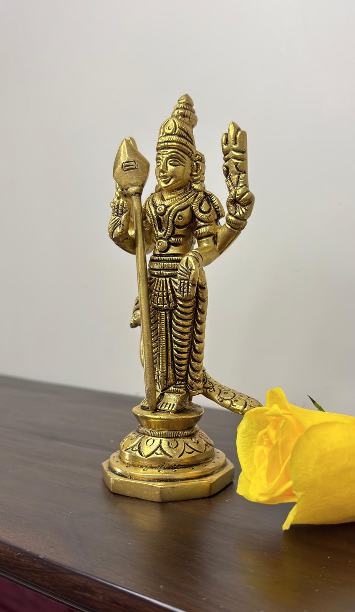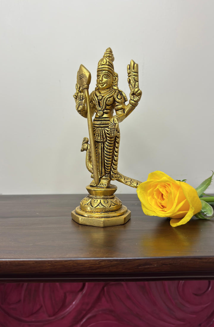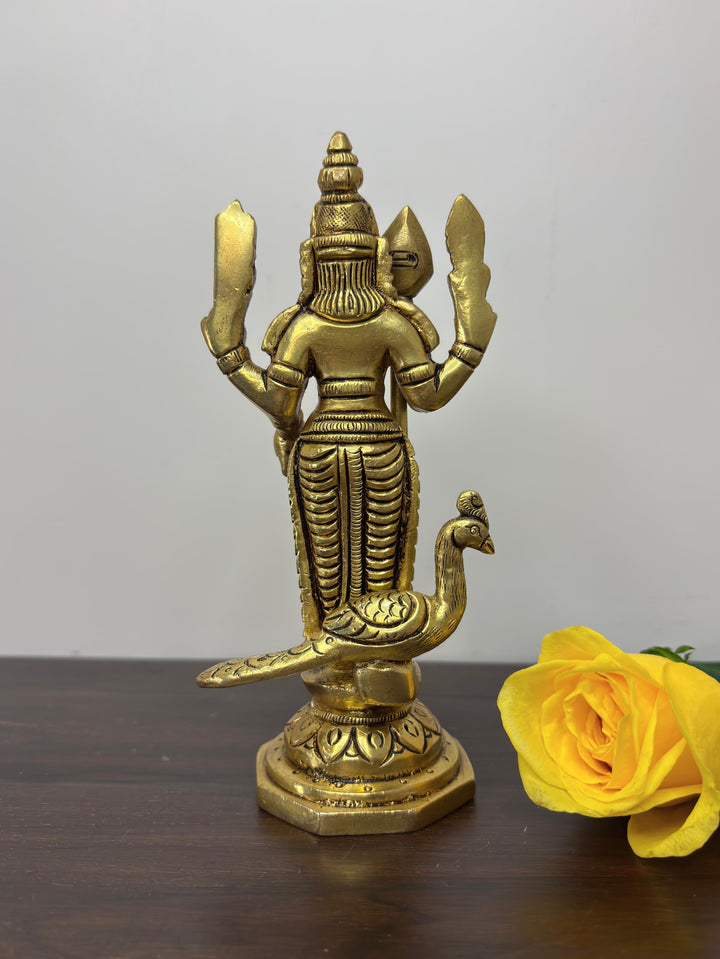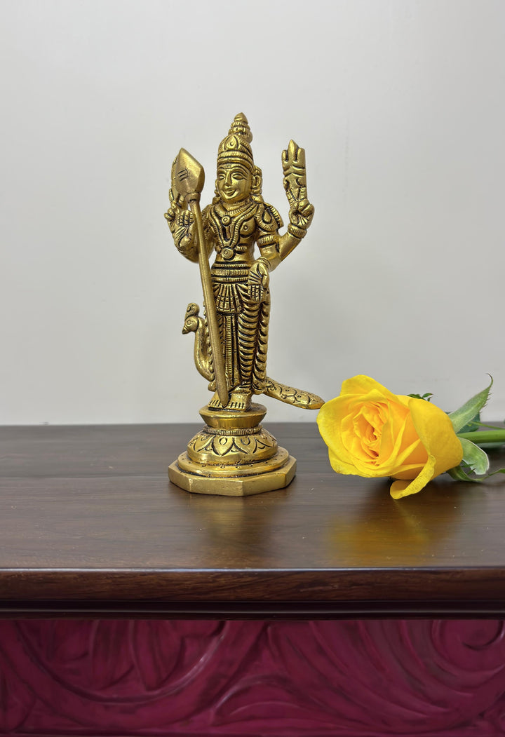 • Special Features: 6 Inches Finely carved idol of Lord Murugan in standing posture, holding the Vel with divine authority, accompanied with a Peacock