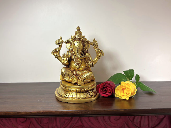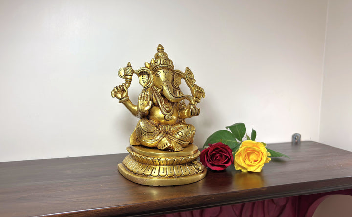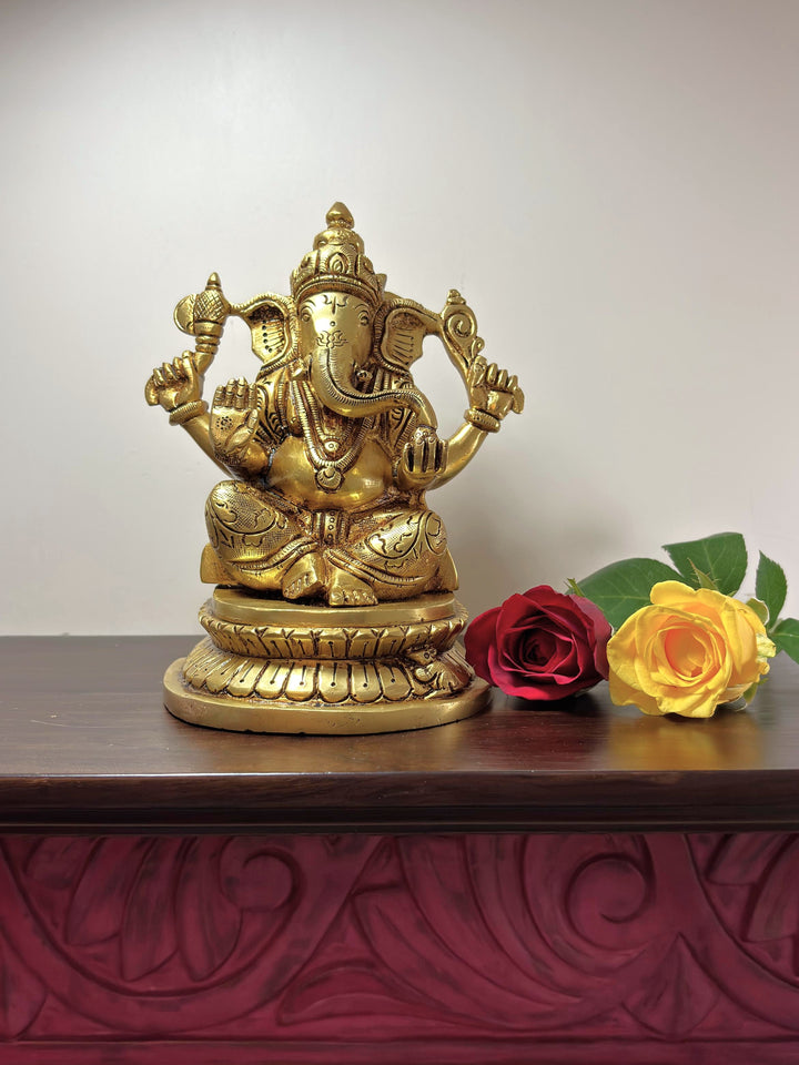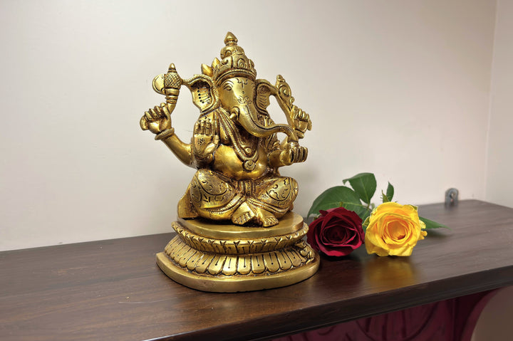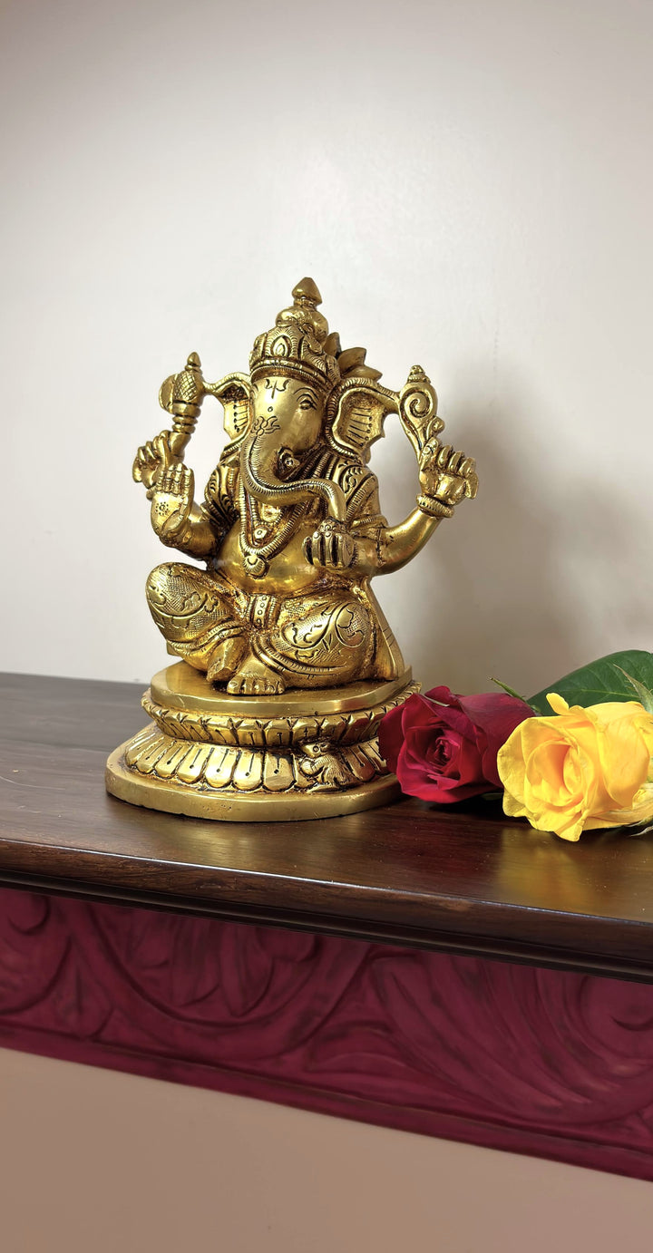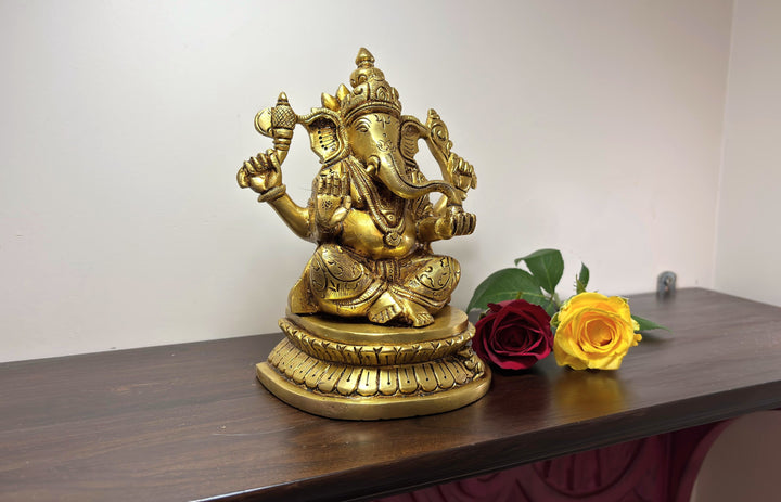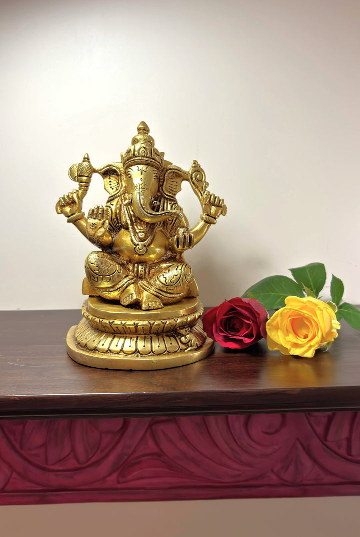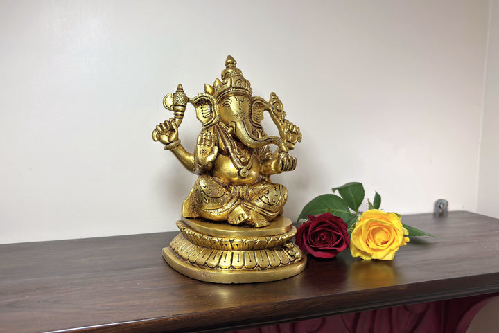 Cast in gleaming brass, this exquisite sculpture of Lord Ganesha embodies divine craftsmanship and sacred symbolism. Every curve and contour are meticulously detailed—from the serene expression on His elephantine face to the delicate tracery of his crown, anklets, and ornaments. His trunk curls gracefully, often touching a Modak, symbolizing the sweetness of spiritual pursuit. This is not merely a statue—it is a living invocation of wisdom, remover of obstacles, and patron of auspicious beginnings.