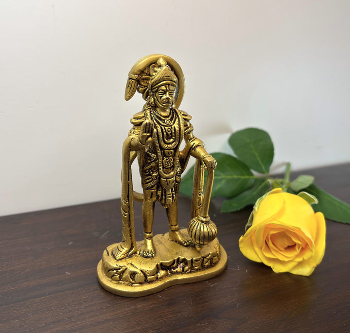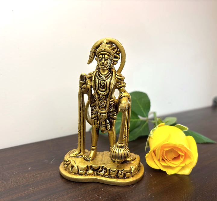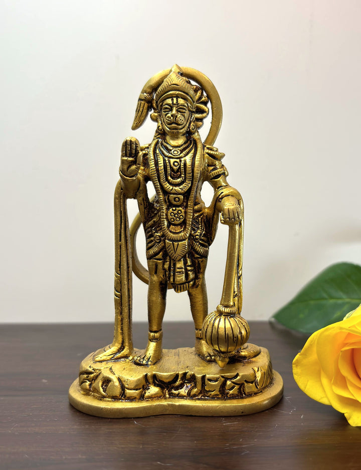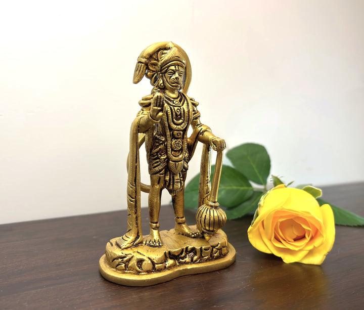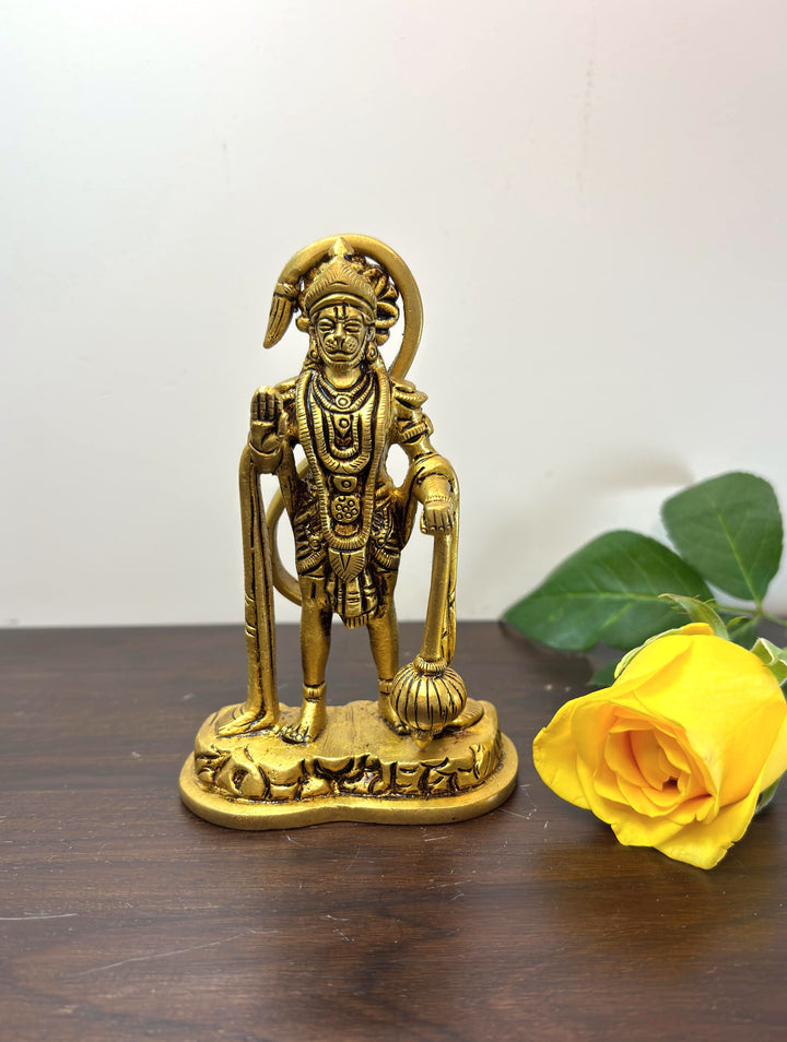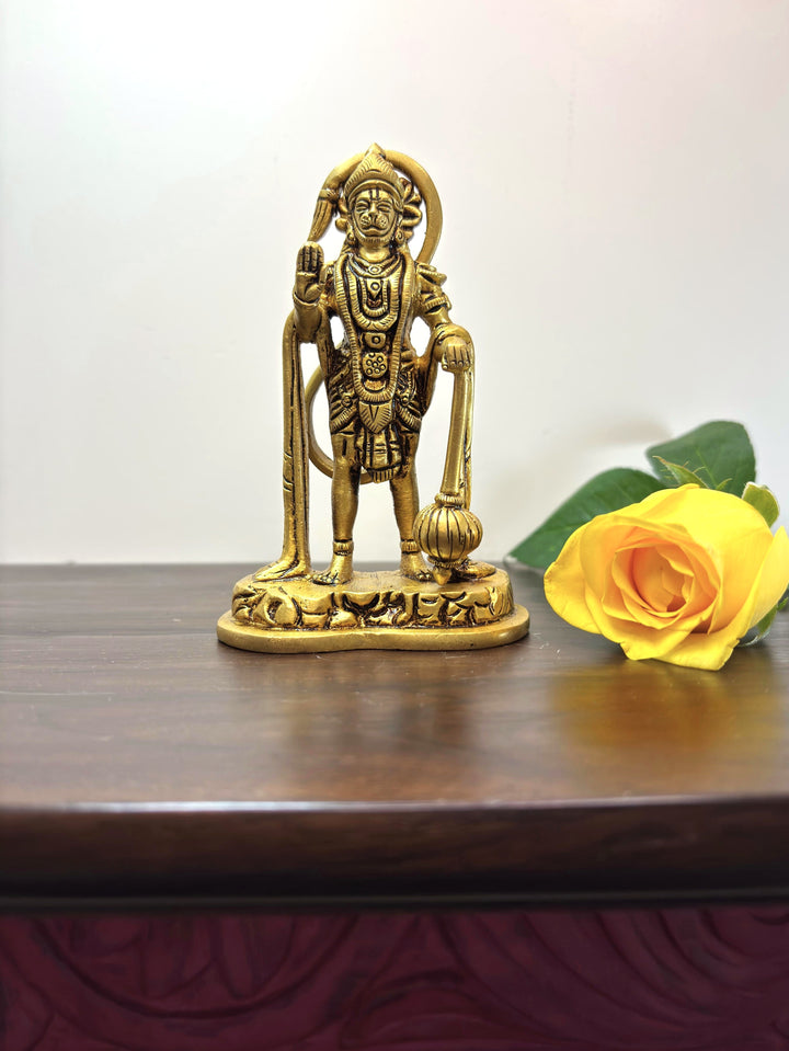 Placing a Hanuman idol with a gada in your home is seen as a source of spiritual protection and positive energy. This 4.2 Inches hand-crafted statue portrays Lord Hanuman in standing posture holding mace (Gada ) is a captivating representation of Hanuman ji’s boundless strength. The right hand is raised in Abhaya Mudra, a gesture of reassurance and fearlessness, offering blessings to devotees. The golden yellow brass material is adding the divine aura of the deity. The craftsmanship reflects deep reverence for the deity adding the spiritual energy to the idol. This Brass statue is a perfect gift for friends and family who value religious iconography.