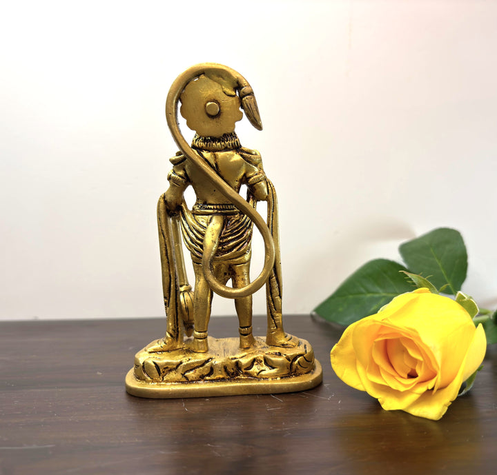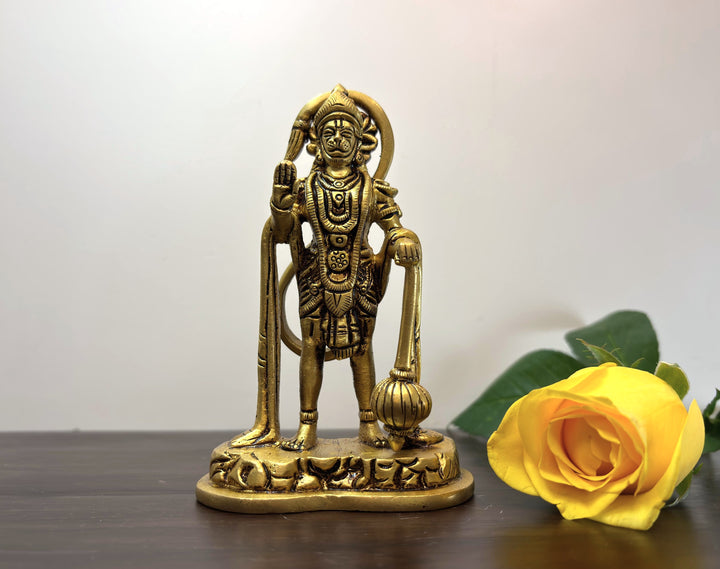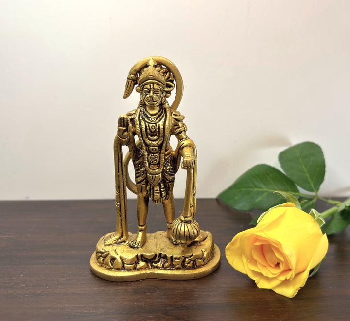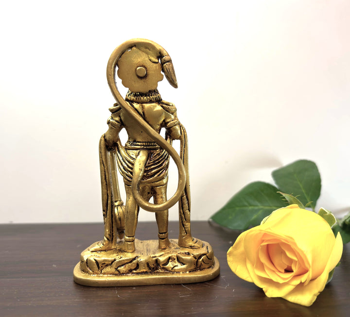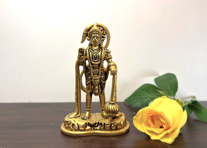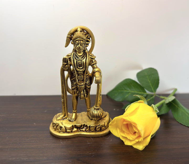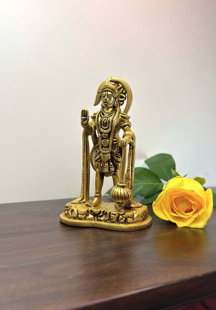 Placing a Hanuman idol with a gada in your home is seen as a source of spiritual protection and positive energy. This 4.2 Inches hand-crafted statue portrays Lord Hanuman in standing posture holding mace (Gada ) is a captivating representation of Hanuman ji’s boundless strength. The right hand is raised in Abhaya Mudra, a gesture of reassurance and fearlessness, offering blessings to devotees. The golden yellow brass material is adding the divine aura of the deity. The craftsmanship reflects deep reverence for the deity adding the spiritual energy to the idol. This Brass statue is a perfect gift for friends and family who value religious iconography.