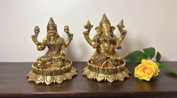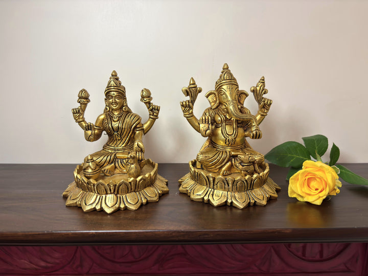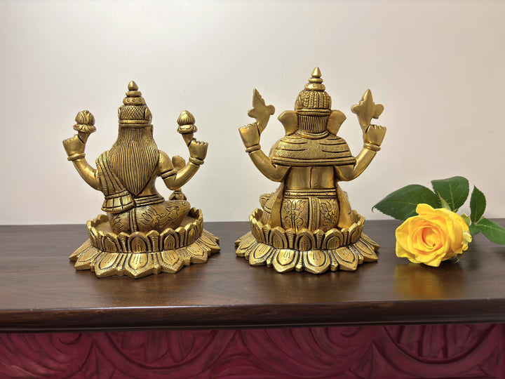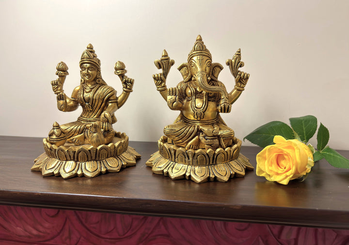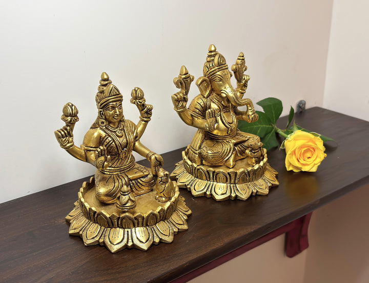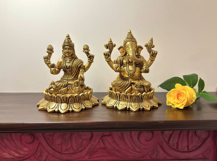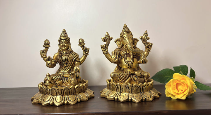 Invoke auspiciousness and abundance with this brass idol of Goddess Lakshmi and Lord Ganesha seated graciously on wide Lotus base. The set of Lakshmi ji & Ganesh ji together is said to bring good fortune & Prosperity: the Shubh & the Labh. This set having Golden Yellow finish having elegant carvings and antique look is ideal for for home temple and as a auspicious home décor.