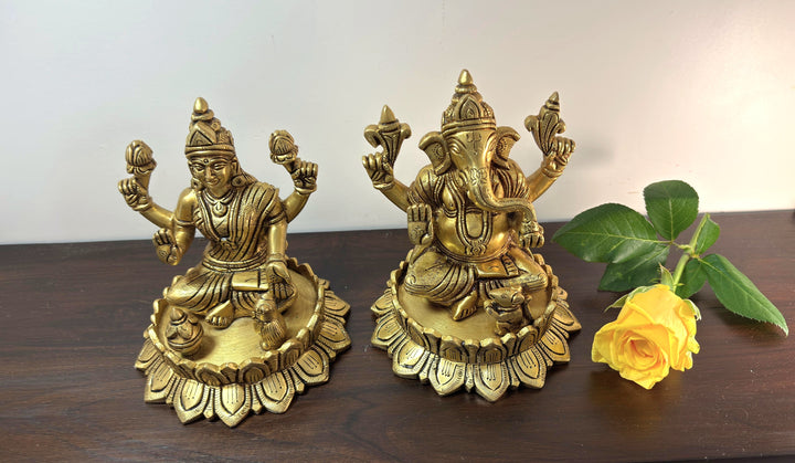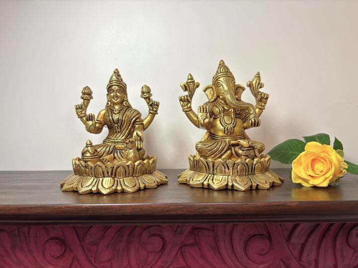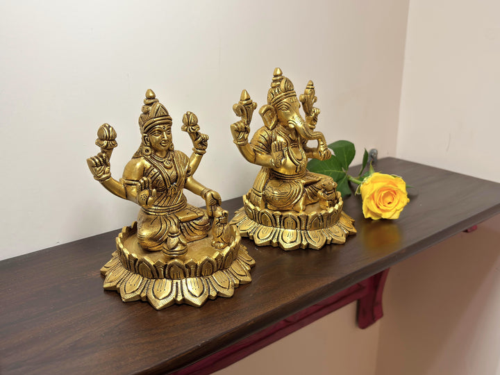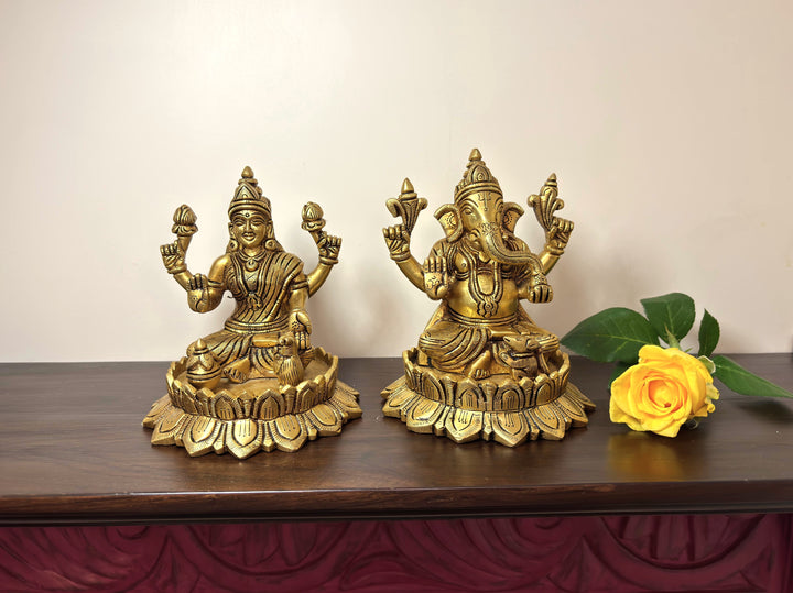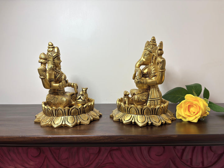 Yathashilpam Set of Lakshmi ji & Ganesh ji on Lotus BaseI Superfine Brass Lakshmi Ganesh idol | Lakshmi Ganesh Peetal Murti